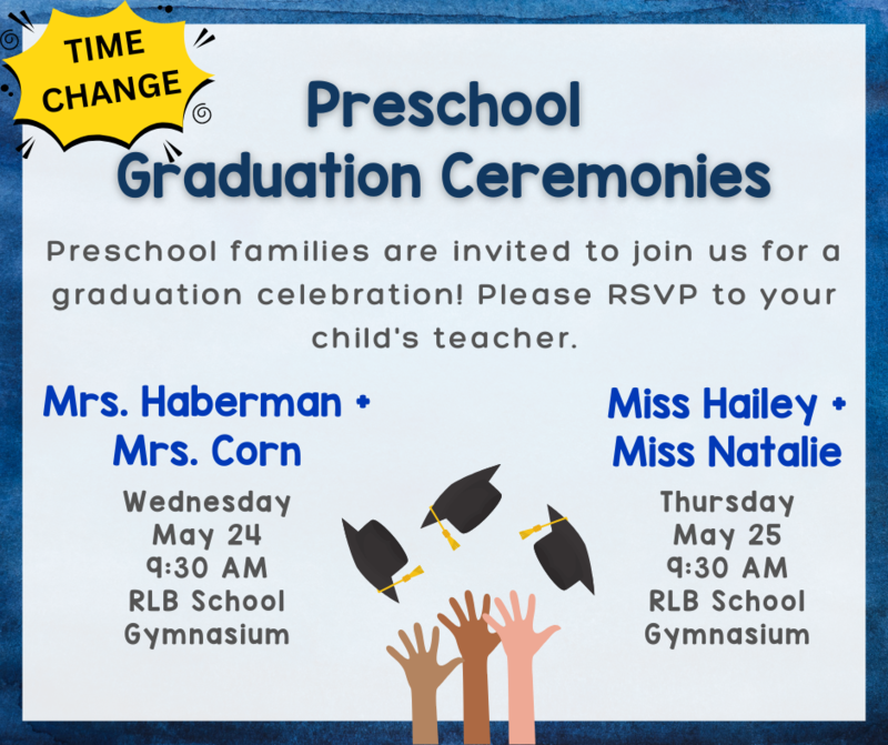 ****UPDATE FOR PRESCHOOL GRADUATIONS: NEW TIME OF 9:30 A.M. FOR BOTH MAY 24th and MAY 25th CEREMONIES.****